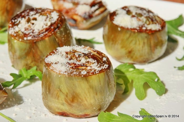 Для обеда на 2 персоны нужно 10-12 штук. Артишоки очень сытные! Очищенные овощи обжариваем в глубокой сковороде с небольшим количеством оливкового масла (2-3 ст.л.) около 7-10 минут в зависимости от того, решите ли вы их разрезать или пожарить целиком, как у меня. Огонь не должен быть большим, иначе вы сожжете или сильно пережарите артишоки, а значит они будут сухими и невкусными. Перед подачей посыпаем артишоки пармезаном (количество произвольное).